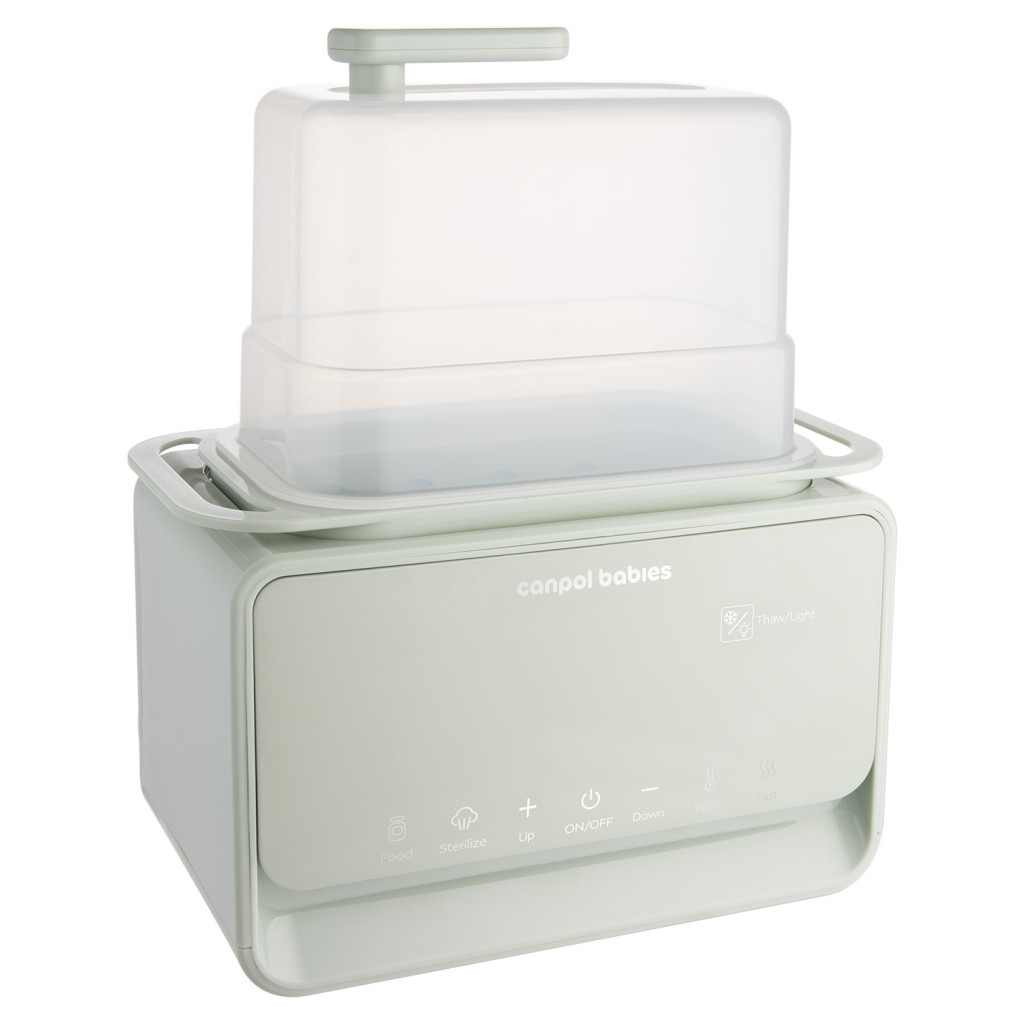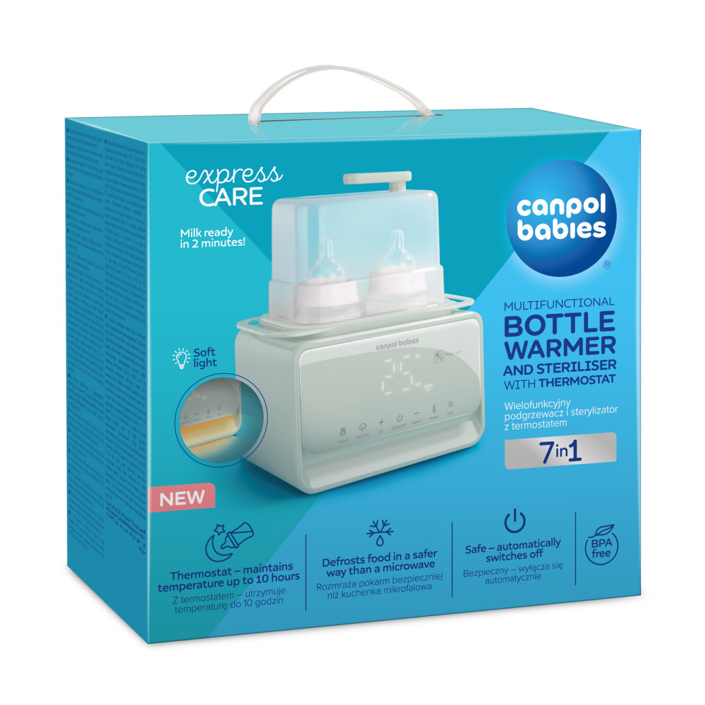 A Canpol Babies 7 az 1-ben cumisüveg melegítő és sterilizáló termosztáttal és lámpával egy multifunkcionális eszköz, amely gyorsabbá és egyszerűbbé teszi az ételek elkészítését. 7 különböző móddal rendelkezik: tejmelegítés, üveges ételek melegítése, gyorsmelegítés (2-3 perc alatt), kiolvasztás, sterilizálás, hőmérséklet fenntartása és éjszakai fény funkció.
