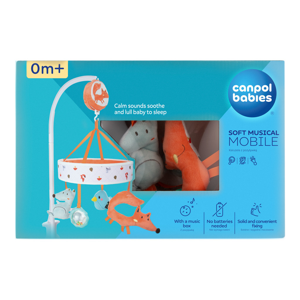 A kiságy fölötti FOX zenélő mobil támogatja a baba fejlődését már újszülött kortól - tökéletesen stimulálja a gyermek vizuális, auditív és motoros koordinációját. A színes játékok vonzzák a baba figyelmét, és támogatják a látás érzékének fejlődését. A zenedoboz kellemes és nyugodt hangjai megnyugtatják a babát, és megkönnyítik az elalvást. A kiságymobil praktikus rögzítő elemmel rendelkezik, amelynek köszönhetően könnyen és stabilan rögzíthető. A babamobil nem igényel elemet, mivel a zenélődobozt kézzel tekerik. Minden játék más-más vonzerővel bír a gyermek számára: zörgő elemek, susogó vagy csörgő. A mobil olyan gyermekek számára készült, akik még nem tudnak önállóan mozogni.